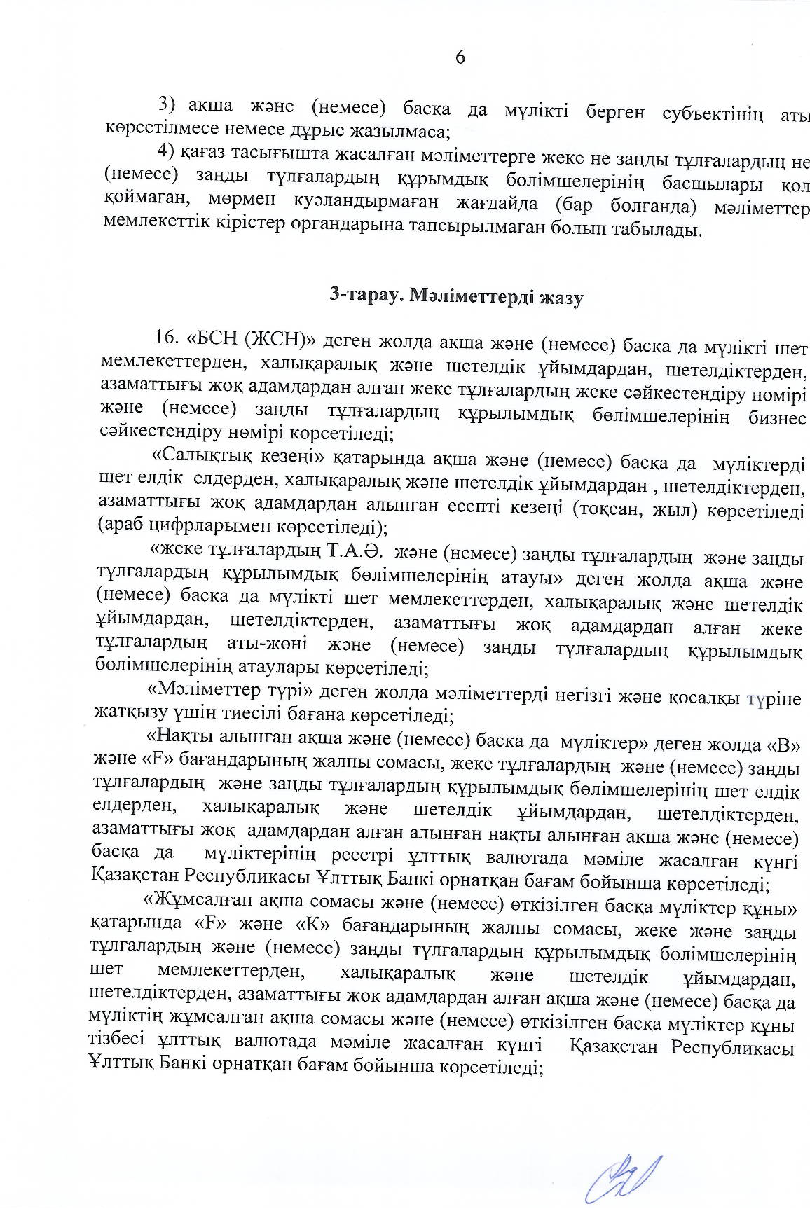 - 2016 жылғы 19 қарашадағы №553 «Жеке және заңды тұлғалардың және (немесе) заңды тұлғаның құрылымдық бөлімшелерінің шет мемлекеттерден, халықаралық және шетелдік ұйымдардан, шетелдіктерден, азаматтығы жоқ адамдардан ақша және (немесе) өзге де мүлік алғаны туралы мәліметтерді мемлекеттік кірістер органдарына хабарлау қағидаларын, нысанын және мерзімдерін бекіту туралы;