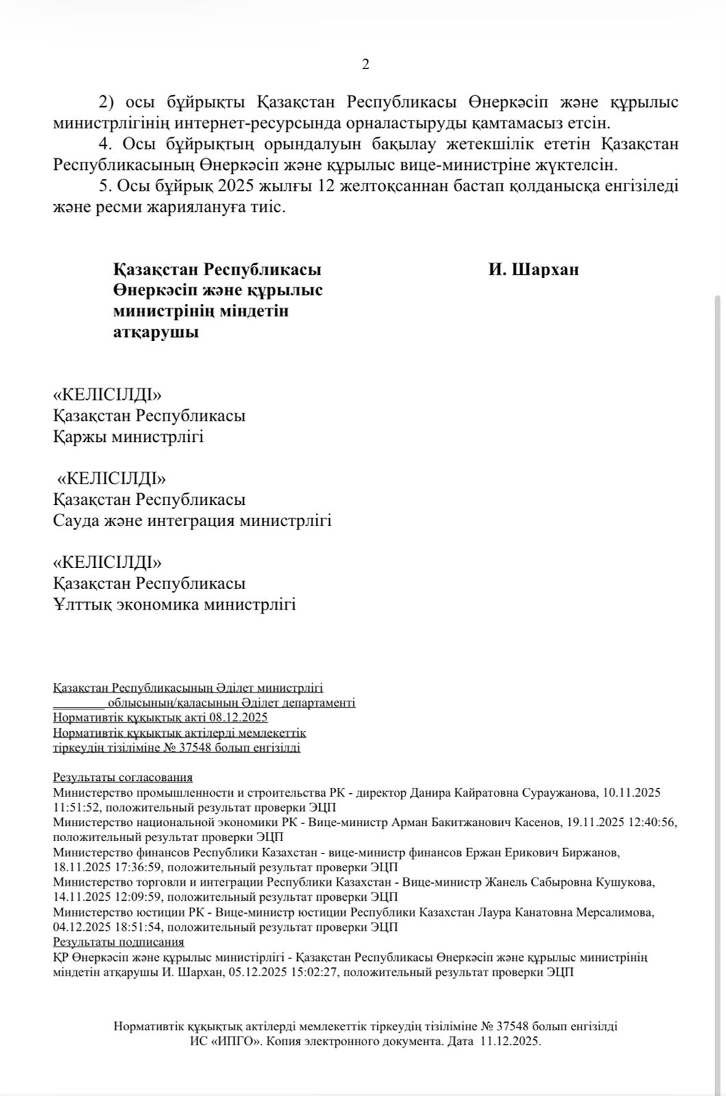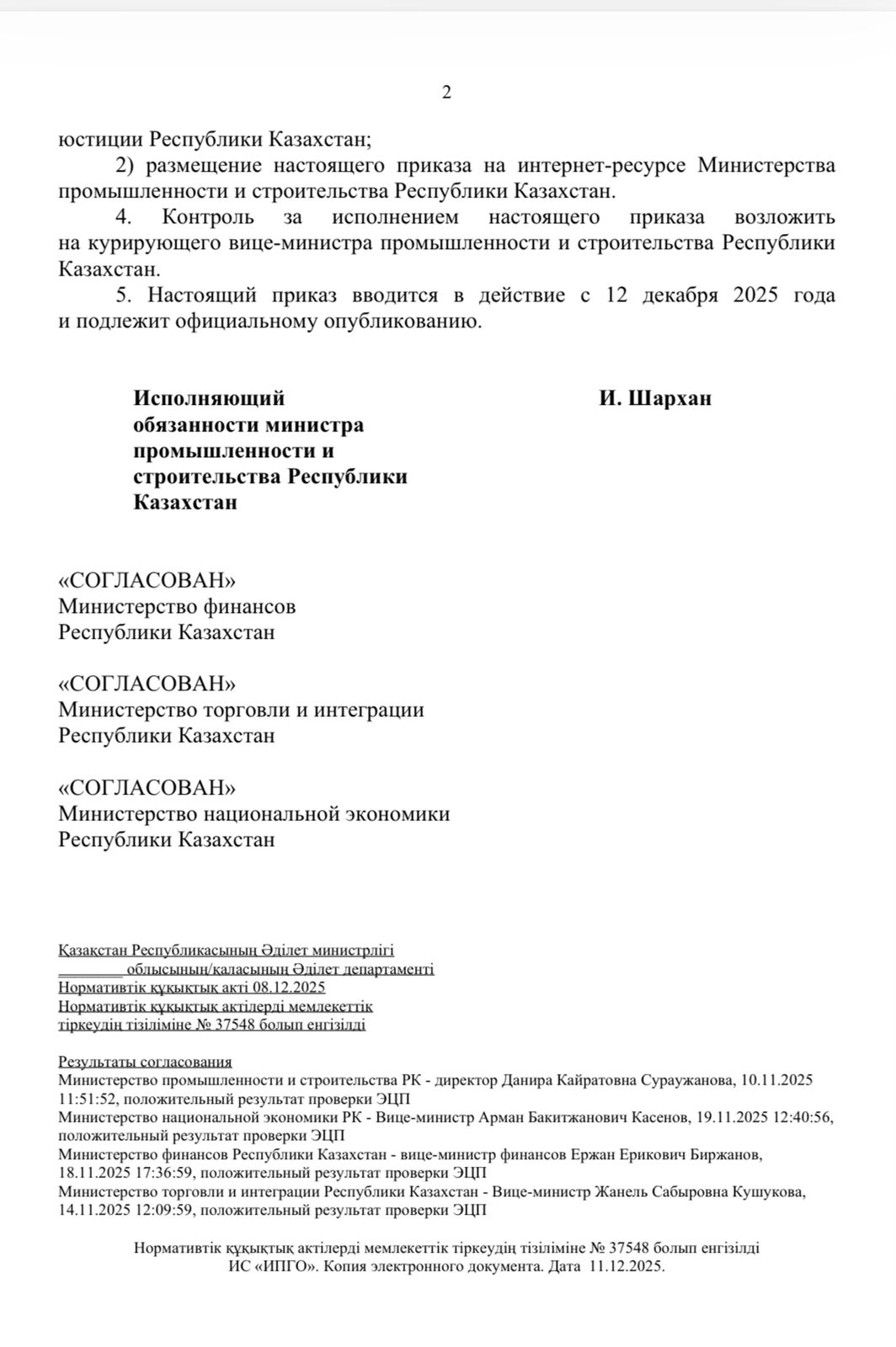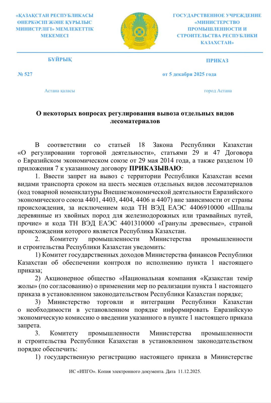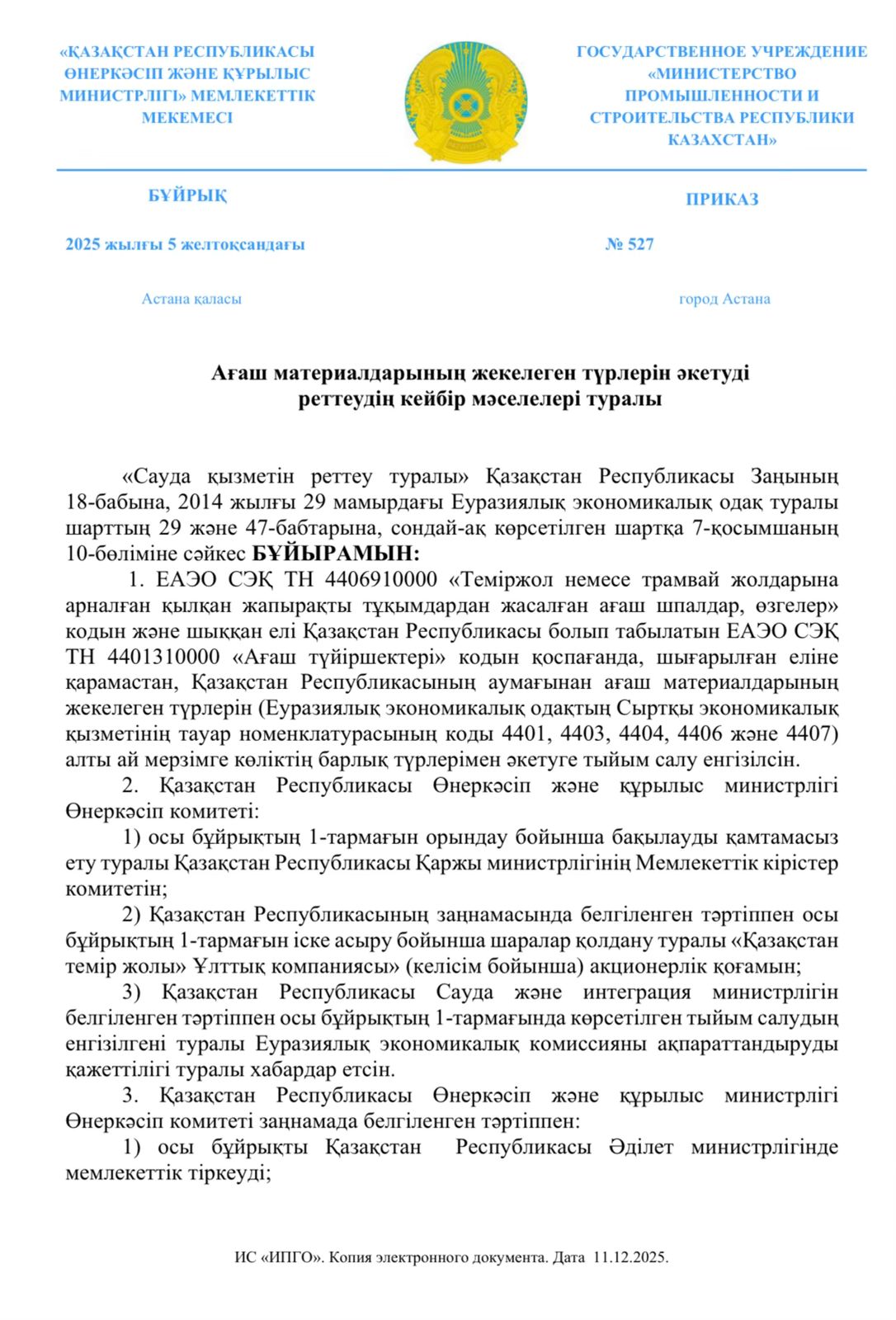 Қазақстан Республикасы Қаржы министрлігінің Мемлекеттік кірістер комитеті кедендік операцияларды жүргізу кезінде жұмыс барысында басшылықа алу  үшін қосымшаға сәйкес тарифтік емес реттеу шараларын қолдану бөлігінде «Ағаштың жекелеген түрлерін әкетуді реттеудің кейбір мәселелері туралы» Қазақстан Республикасы Өнеркәсіп және құрылыс министрілігінің 2025 жылғы 05 желтоқсандағы № 527 бұйрығы